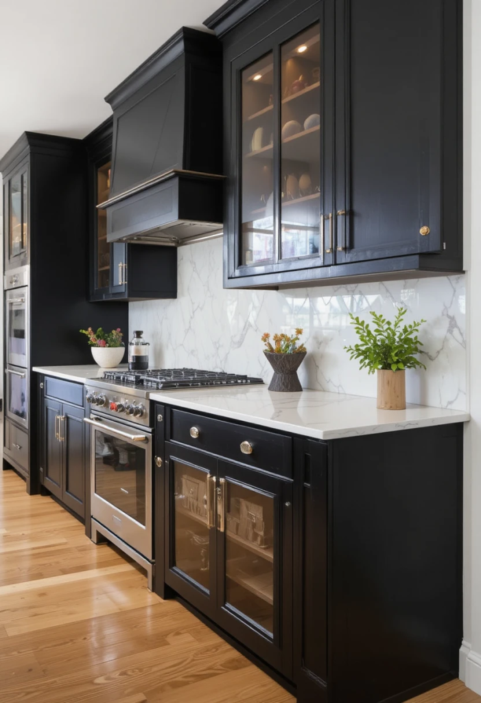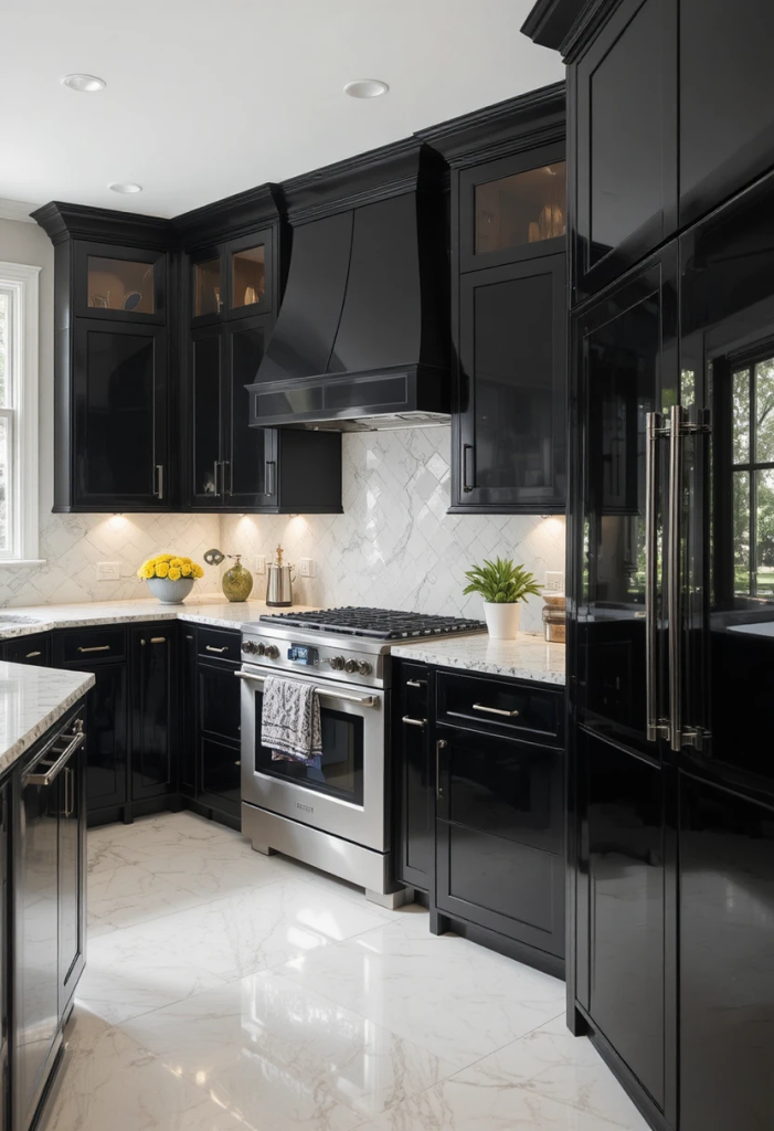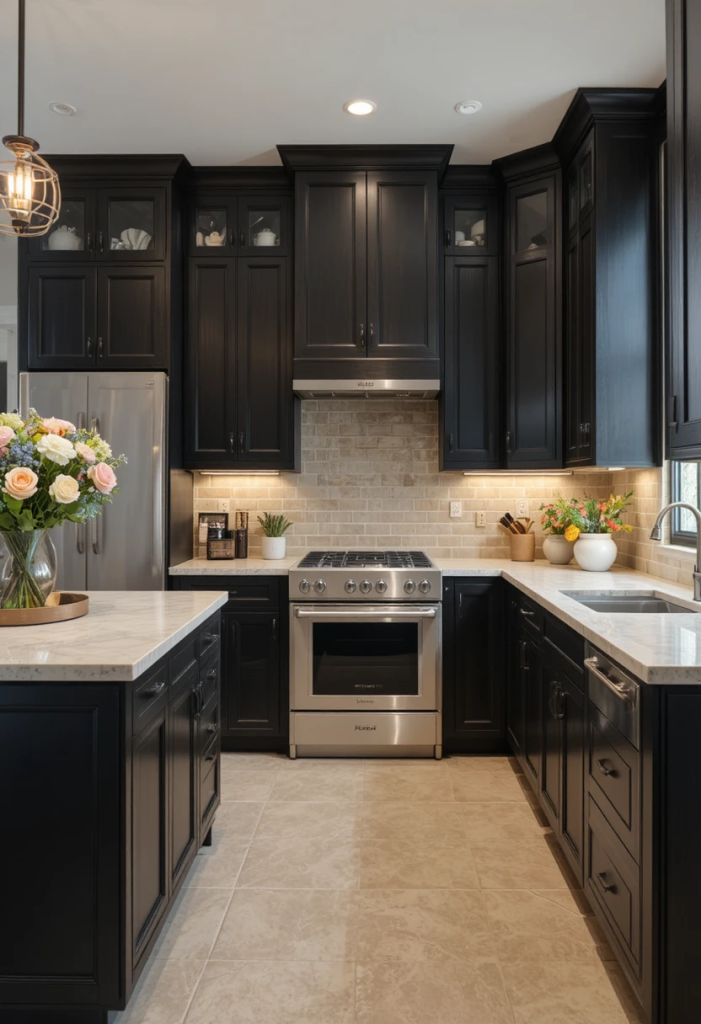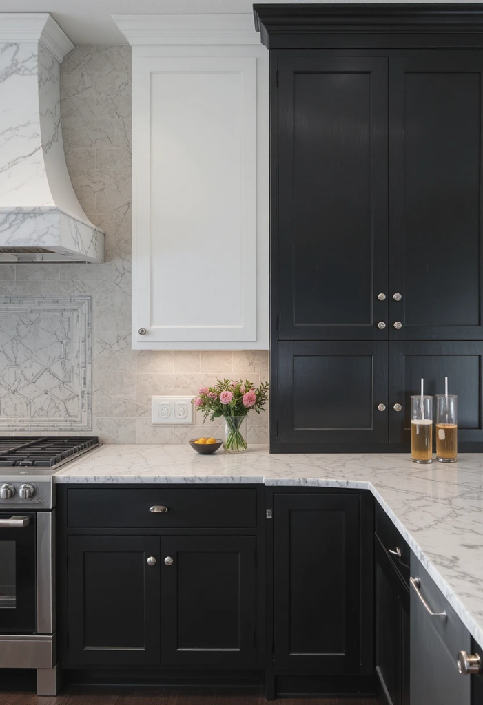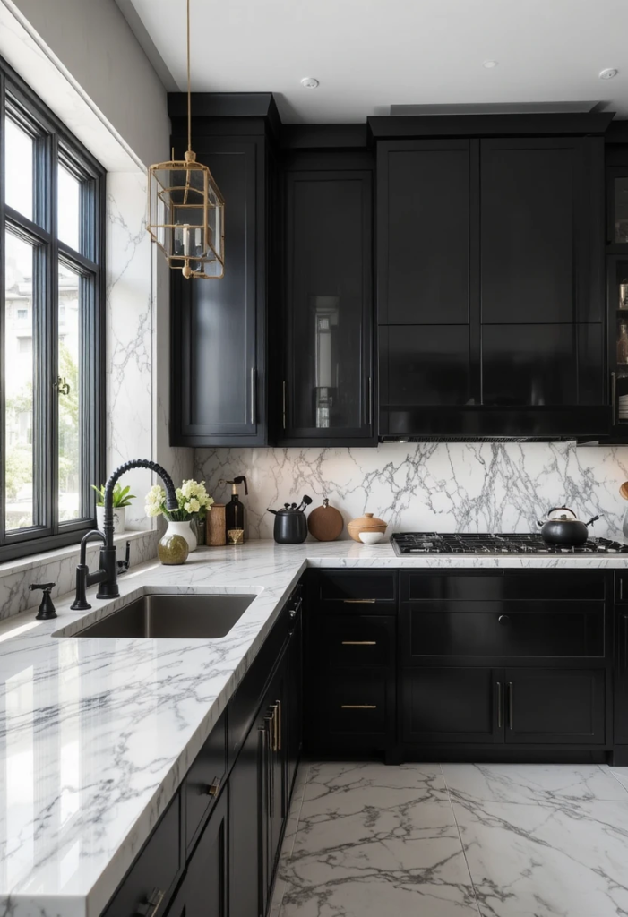 Pairing black cabinets with white marble countertops creates a high-contrast, luxury aesthetic that never goes out of style.