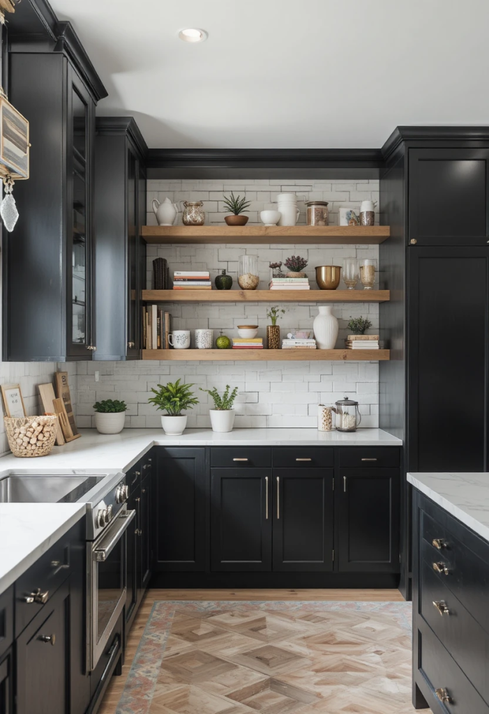 Mix black lower cabinets with open shelves to create a modern and airy look.