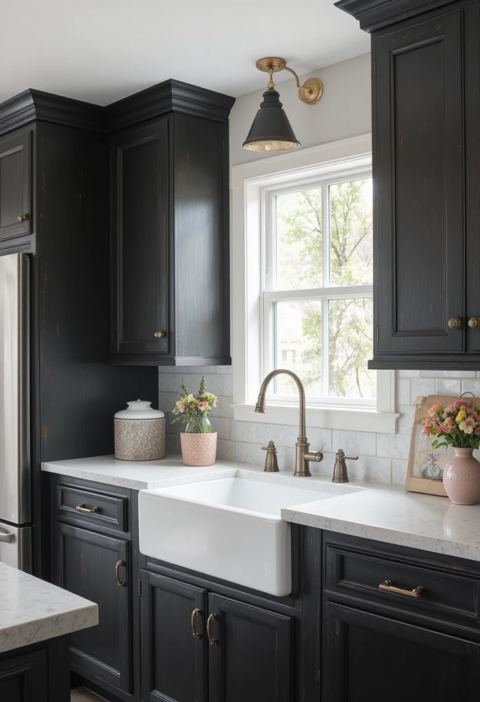 Distressed or textured black cabinets bring a rustic farmhouse charm.