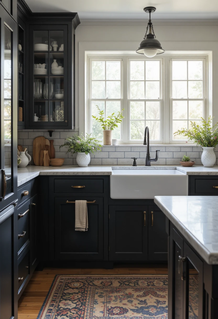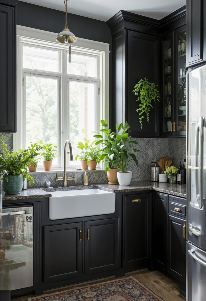 Combine black cabinets with farmhouse sinks and vintage elements for a classic yet modern blend.