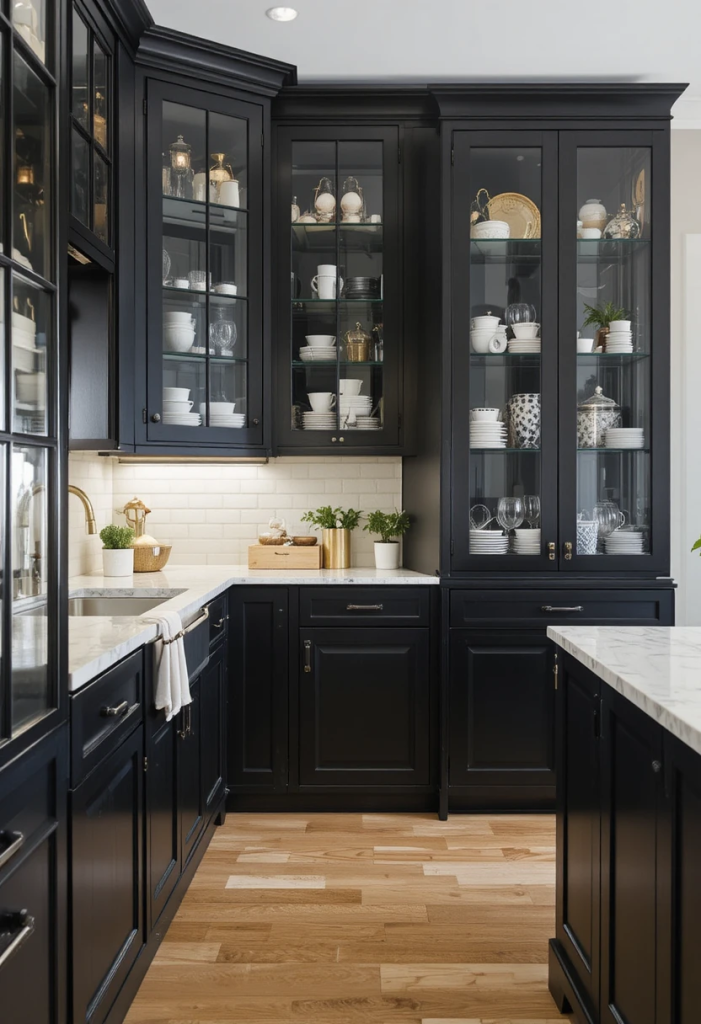 Glass doors break the heaviness of black and allow you to display stylish dishware.