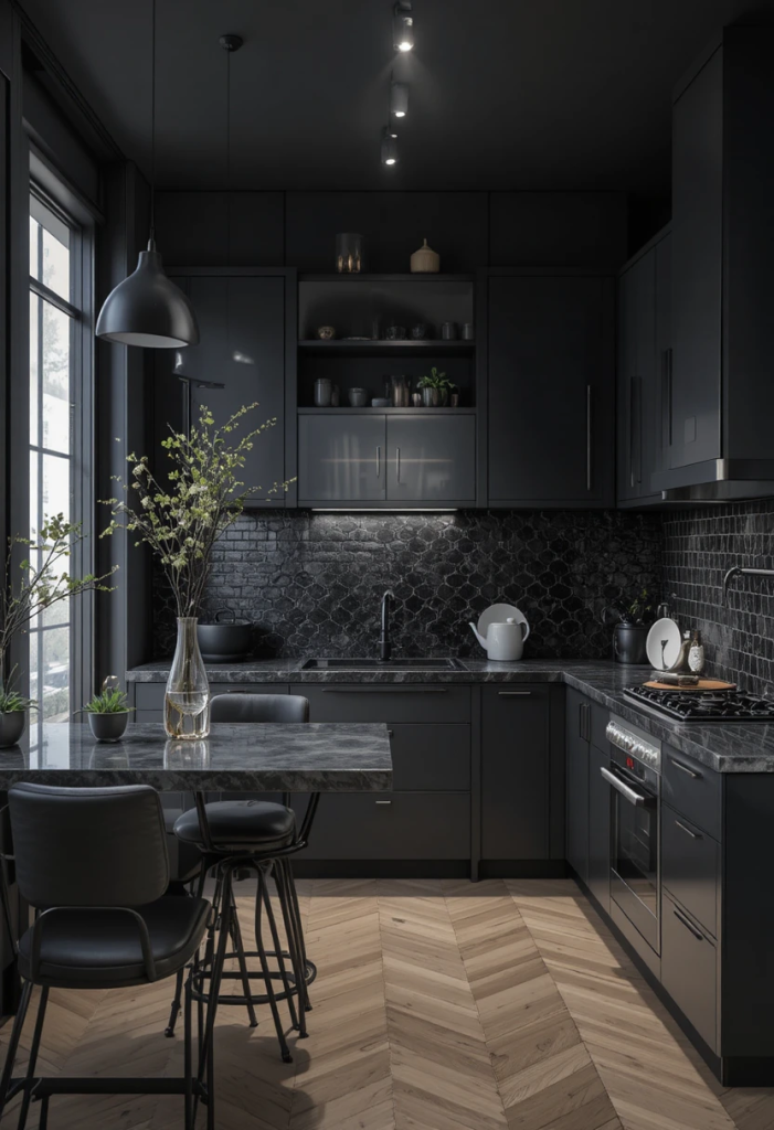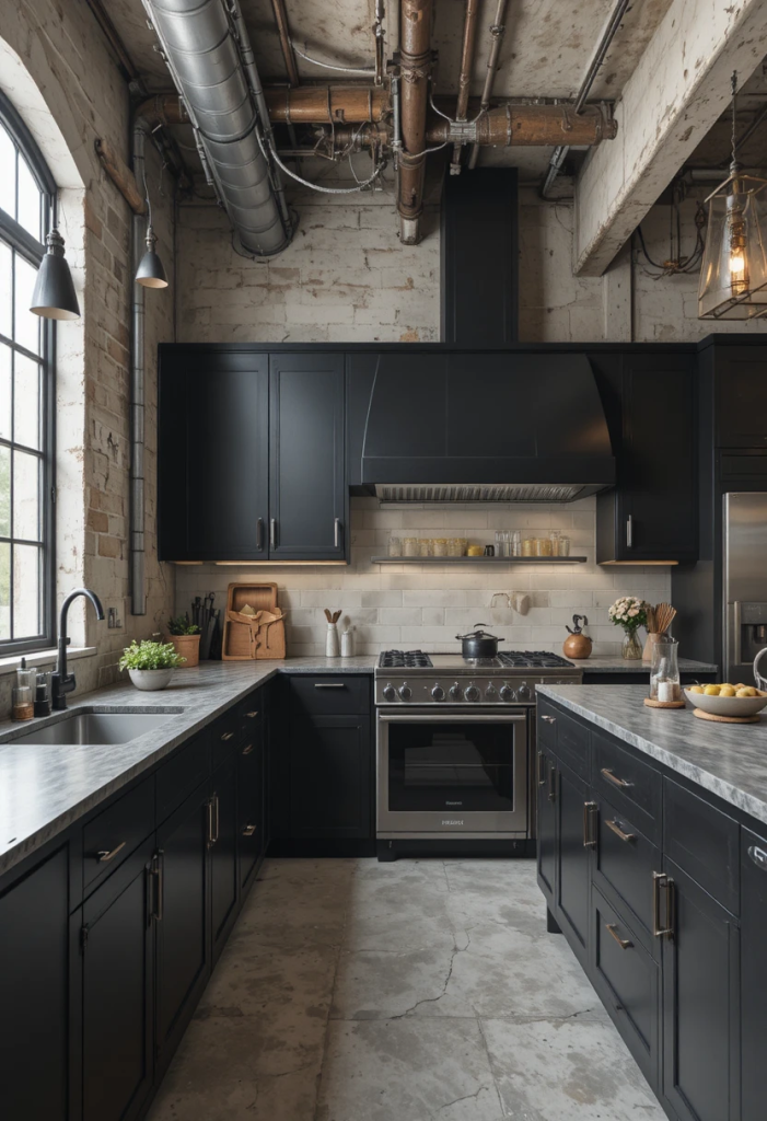 Combine black cabinets with metal, concrete, and exposed elements for an urban industrial vibe.