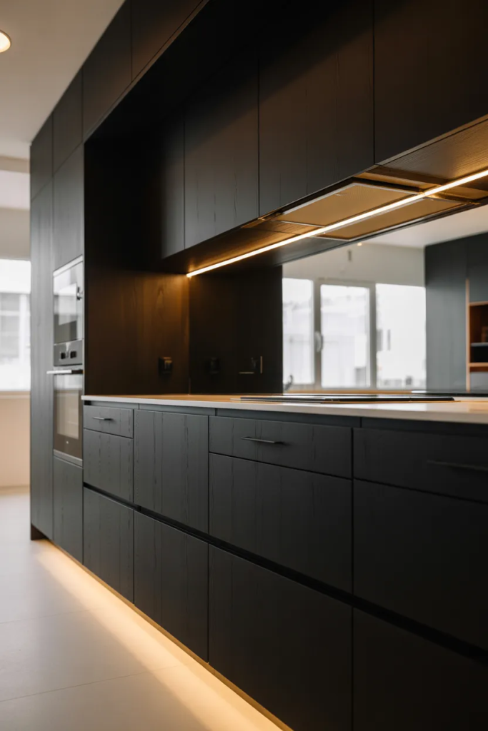 Matte black cabinets give a soft, modern finish that looks clean and elegant.