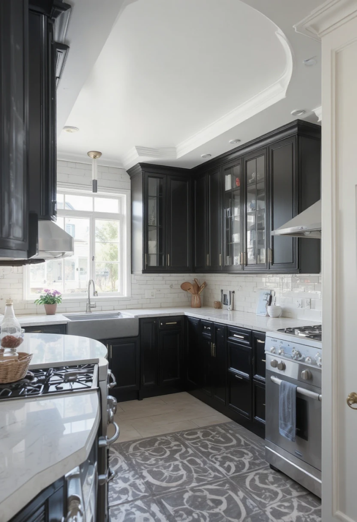 Pair black cabinets with a lighter ceiling to create depth and balance in the space.