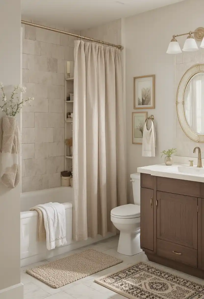 Switch out accessories like towels, rugs, and shower curtains in neutral tones to achieve an earthy look without overspending.