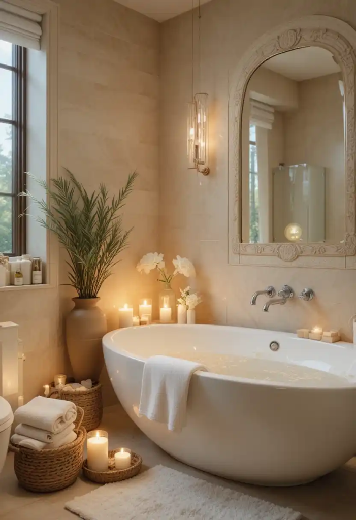 Turn your bathroom into a personal spa with candles, essential oils, and soft textures for ultimate relaxation.