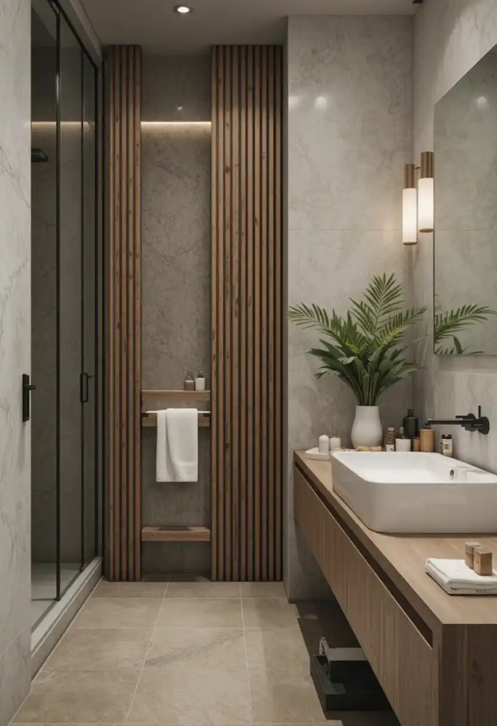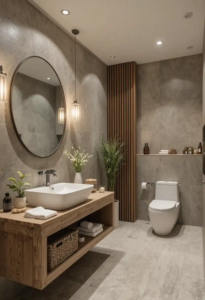 Wooden cabinets, floating shelves, or accent walls can instantly make your bathroom feel cozy and grounded.