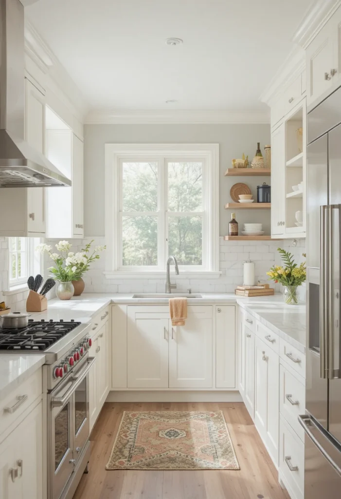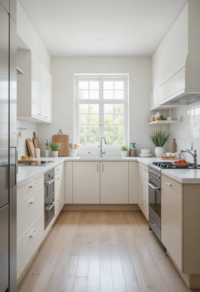 Light shades like cream and off-white help reflect light and make kitchens feel bigger. Light Kitchen Colours Idea for Small Kitchens That Maximize Space, Brightness, Airiness, and Create an Open, Clean, and Fresh Interior Feel.