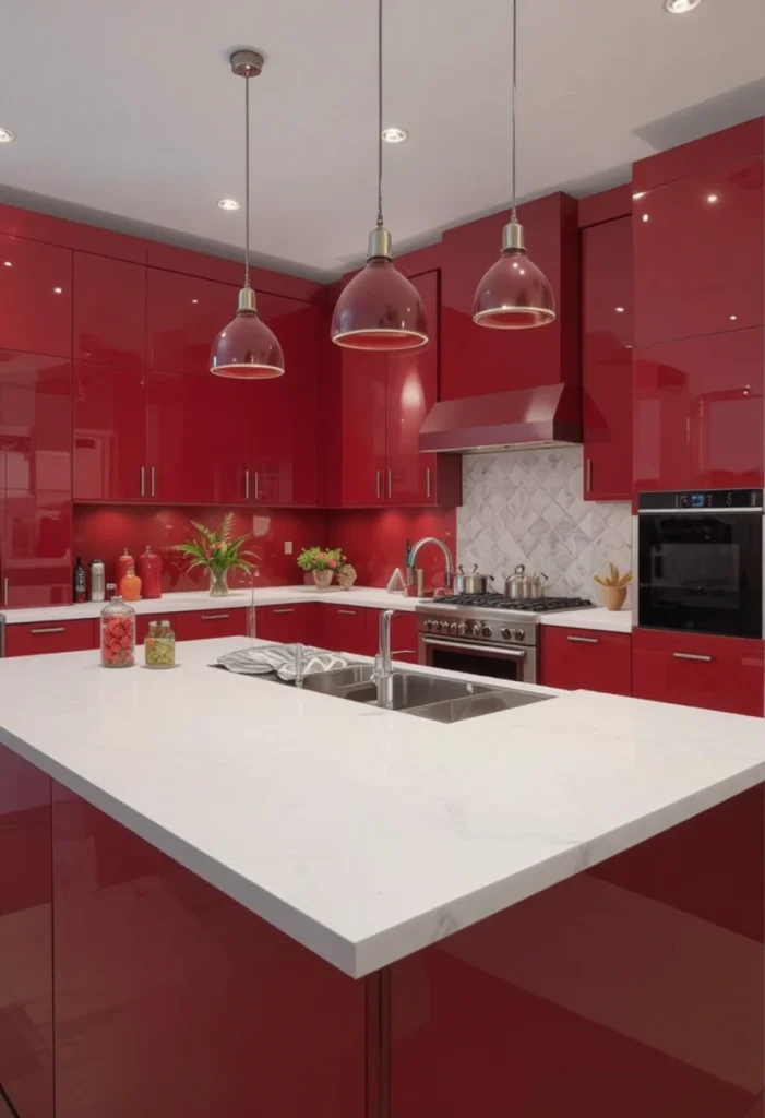 Red is energetic and eye-catching, perfect for accent walls or cabinets. Red Kitchen Colour Ideas for Bold, Passionate, Vibrant, and Eye-Catching Kitchen Designs That Make a Strong Statement in Modern Home Interiors.