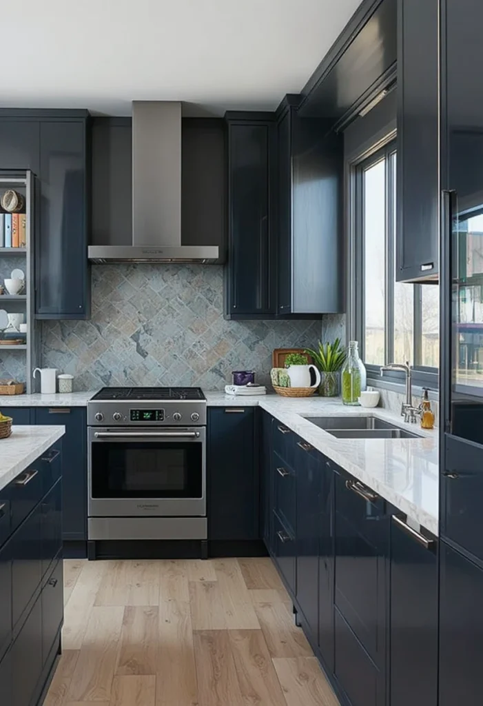 Soft blue tones create a peaceful atmosphere, while navy blue adds depth and sophistication. Blue Kitchen Colours Idea for Calm, Peaceful, Refreshing, and Modern Kitchen Interiors That Bring a Soft Coastal and Relaxing Home Atmosphere.