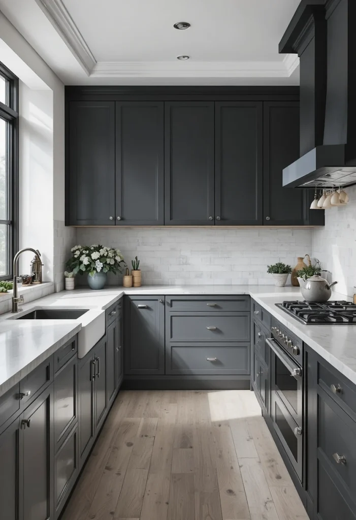 Dark tones like charcoal and deep brown create a high-end, dramatic look. Dark Kitchen Colours Idea for Dramatic, Bold, Rich, and Luxury-Inspired Interiors That Create a Powerful and Sophisticated Kitchen Atmosphere.