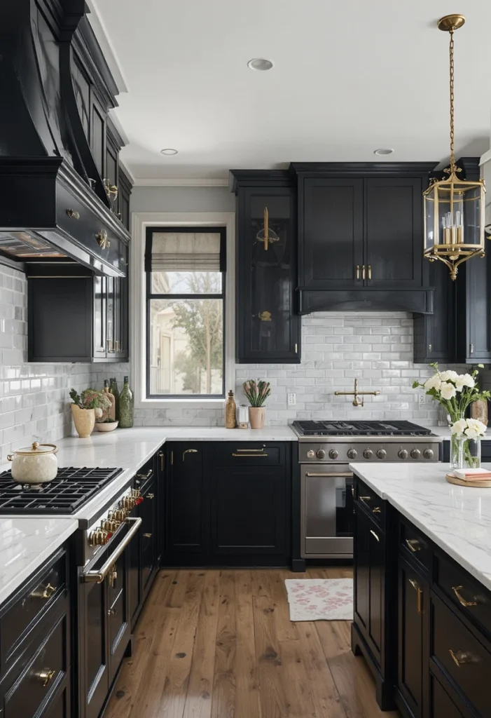 Black kitchens add drama and elegance. Pair with gold or brass hardware for a luxurious finish. You can also explore more inspiration in this detailed guide on black kitchen cabinet ideas. Black Kitchen Colours Idea for a Bold, Luxury, Elegant, and High-End Modern Look That Transforms Any Ordinary Kitchen Into a Premium Designer Space