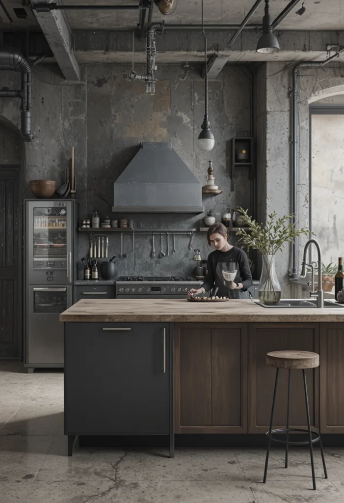 Use dark tones, metal accents, and concrete finishes for an edgy look.Industrial Kitchen Colours Idea for Raw, Edgy, Urban, and Modern Loft-Style Interiors Using Dark Tones, Metal Finishes, and Concrete Textures.