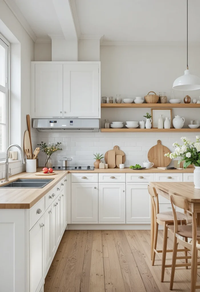 Light colors, natural wood, and minimal decor create a cozy yet modern feel. Scandinavian Kitchen Colours Idea for Bright, Airy, Minimal, and Cozy Nordic-Inspired Spaces Using White, Wood, and Soft Neutral Tones.