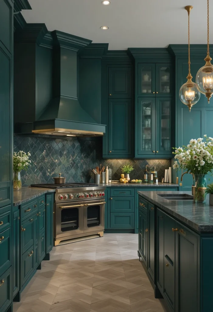 Deep colors like emerald green or navy paired with gold accents create a premium look. Luxury Kitchen Colour Idea for Premium, Elegant, High-End, and Sophisticated Interiors Using Deep Tones, Gold Accents, and Rich Textures.