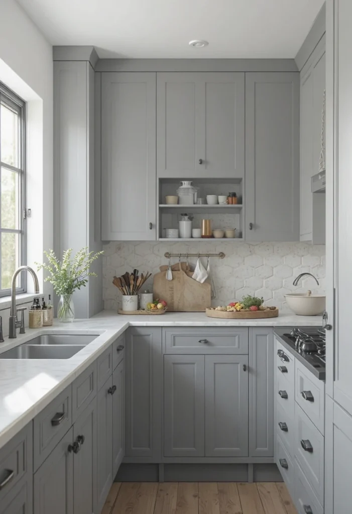 Grey is versatile and works well with both warm and cool tones. It’s perfect for a sleek, contemporary kitchen. Grey Kitchen Colours Idea for a Stylish, Balanced, Neutral, and Contemporary Kitchen Design That Works Perfectly in Both Small and Large Homes.