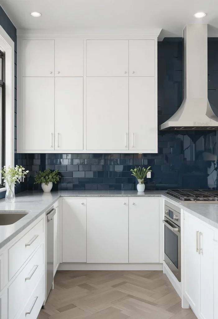 Mixing two colors, like white and navy, adds visual interest and depth. Two-Tone Kitchen Colours Idea for Stylish Contrast, Visual Depth, and Modern Interior Design That Combines Two Beautiful Shades for a Balanced Look.