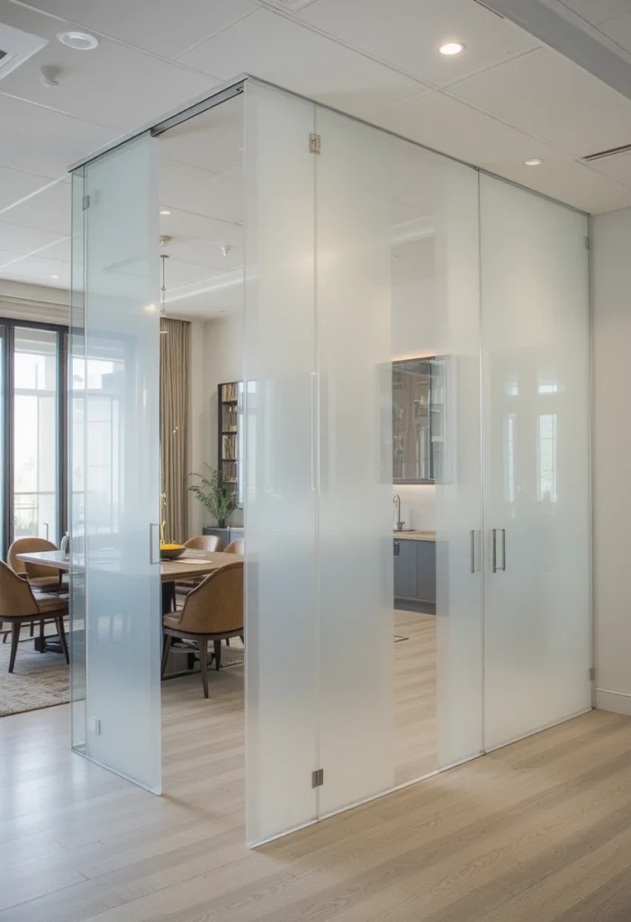 Glass partitions are ideal for maintaining an open and airy feel. Whether clear or frosted, they divide the space without blocking natural light. This option works best in smaller homes where you want separation but still need brightness and visual continuity throughout the room.