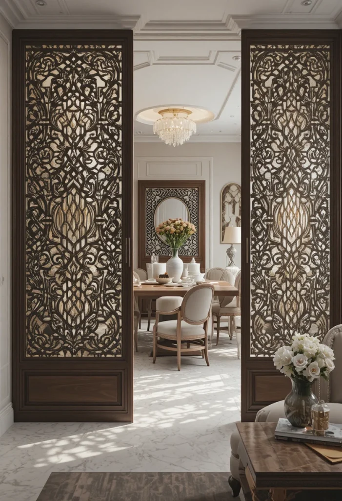 Jali panels add an artistic and cultural touch to your home. Their intricate patterns create beautiful light and shadow effects. These partitions are perfect for adding elegance while maintaining partial openness in your Living Room Partition Ideas.