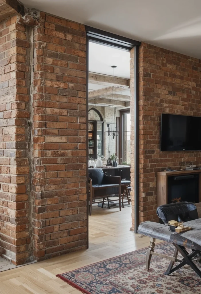 A brick-style partition introduces a rustic and industrial feel. Whether real or faux, it adds texture and character to your living room. This design works well in loft-style homes or spaces with a bold interior theme.