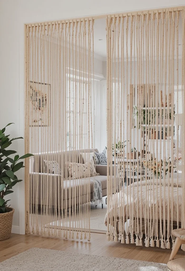 Beaded or string partitions offer a creative and artistic way to divide space. They add movement and personality to your Living Room Partition Ideas. This idea is ideal for casual or bohemian interiors where a relaxed vibe is desired.