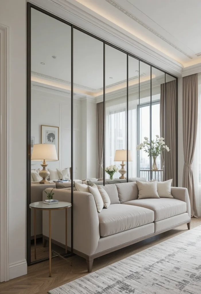 Mirror partitions make your living room appear larger and brighter. They reflect light and create the illusion of more space. This is an excellent option for small apartments where maximizing space visually is important.