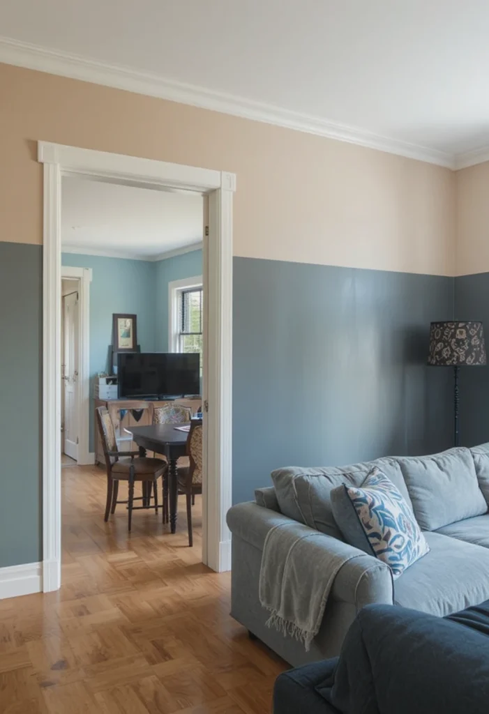 Instead of physical partitions, color-blocking uses paint to define areas. Different shades create visual separation while keeping the space open. This is a simple and budget-friendly way to organize your living room.