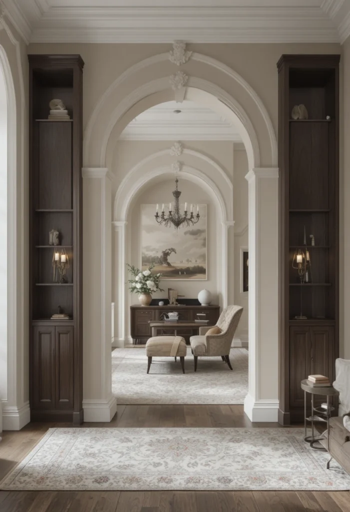 Arches bring a timeless and elegant look to your living room. They create a soft division between spaces while adding architectural interest. This design blends traditional charm with modern aesthetics beautifully.