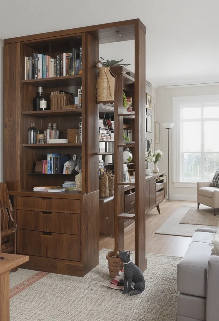 A wooden cabinet can act as both storage and a partition. It helps keep your living room organized while dividing spaces effectively. This idea is practical and stylish, especially for smaller homes.