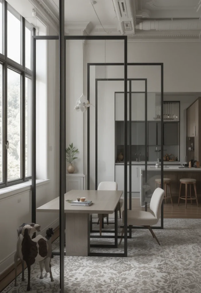 Metal frame partitions give your living room partition ideas a sleek and industrial look. They can be paired with glass or wood to create a balanced design. This style is ideal for modern interiors that focus on clean lines and minimalistic elements.