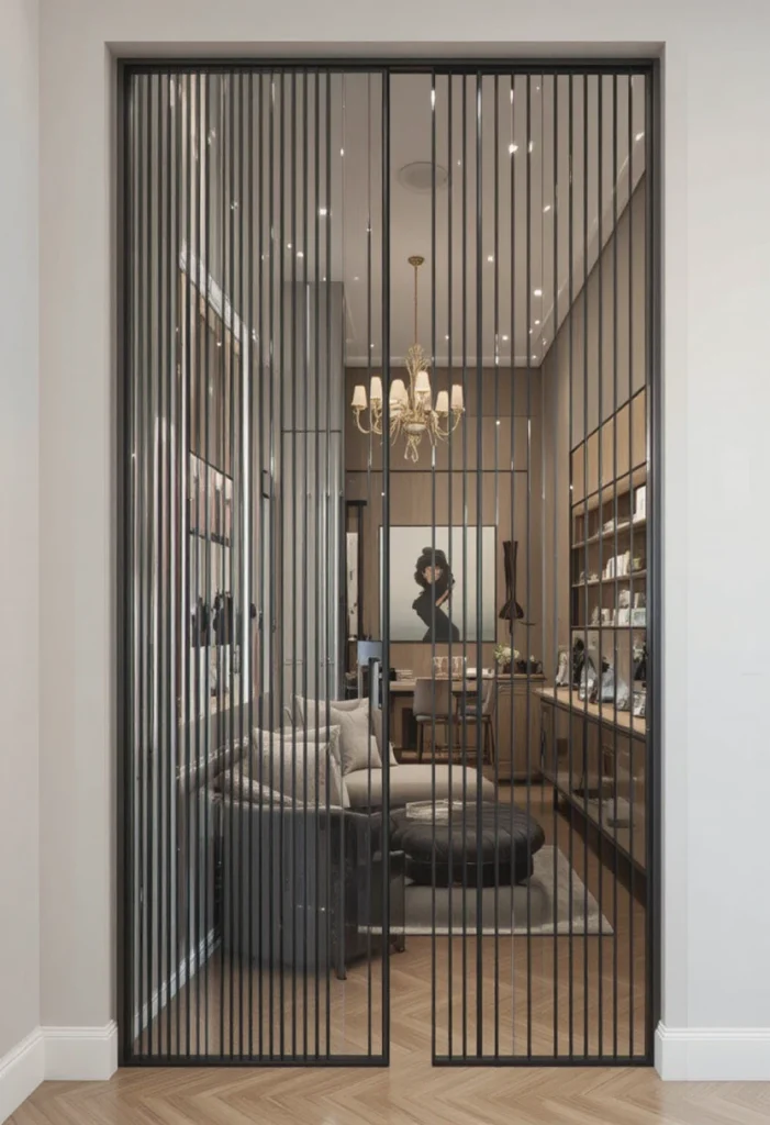 A combination of glass and metal creates a sophisticated and contemporary partition. It balances transparency with structure, making it both stylish and functional. This design works well in high-end and modern living spaces.