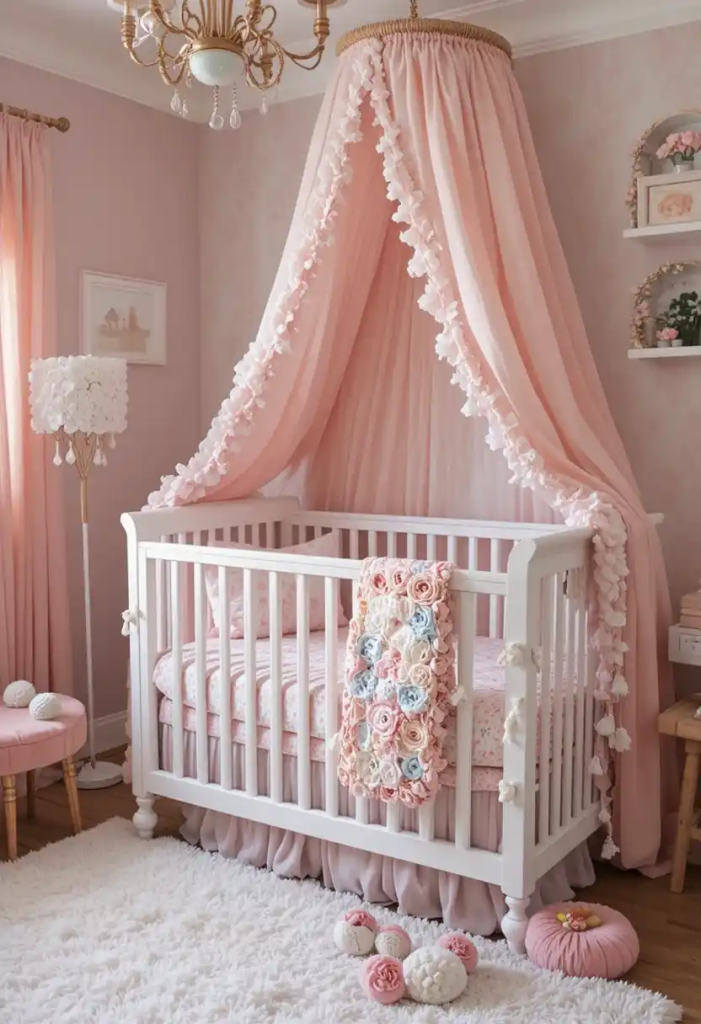Adding a canopy above the crib creates a magical and cozy feel. Dreamy nursery ideas like this are trending on Pinterest because they make the space feel soft and inviting. Choose light, breathable fabrics to maintain safety while enhancing the overall look.