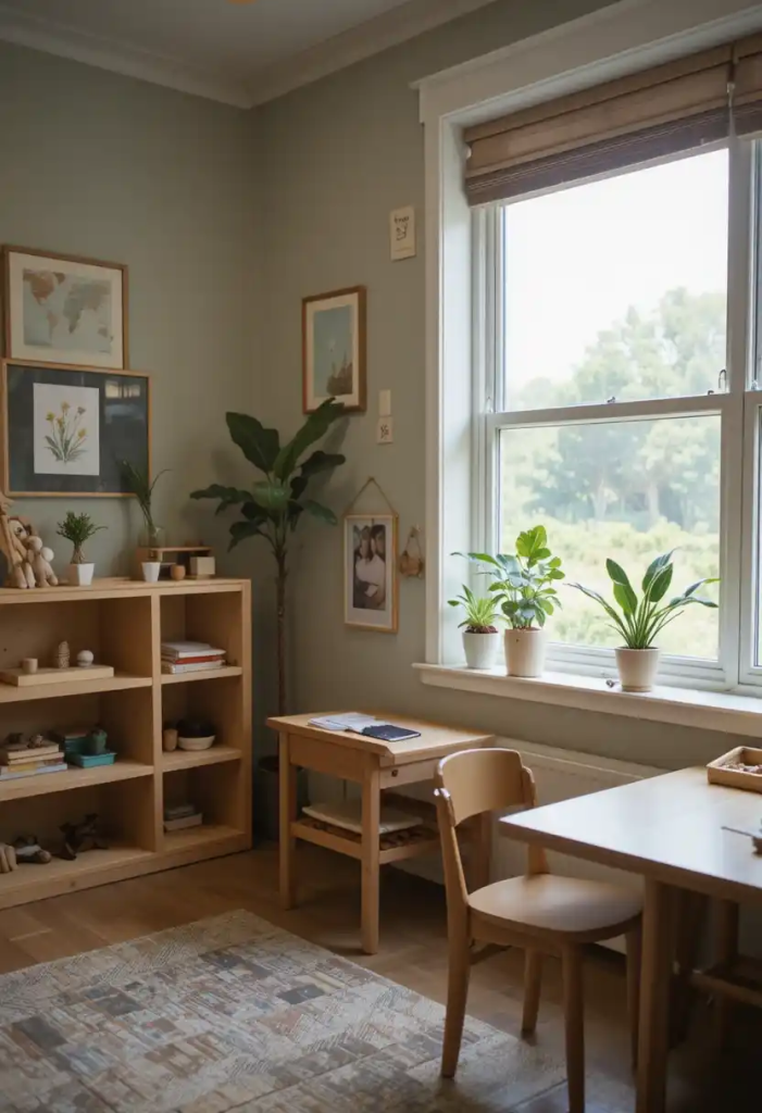 A Montessori nursery setup encourages independence from an early age. Low shelves, floor beds, and accessible toys allow babies to explore safely. This design approach is not only practical but also supports early development in a calm and organized environment.