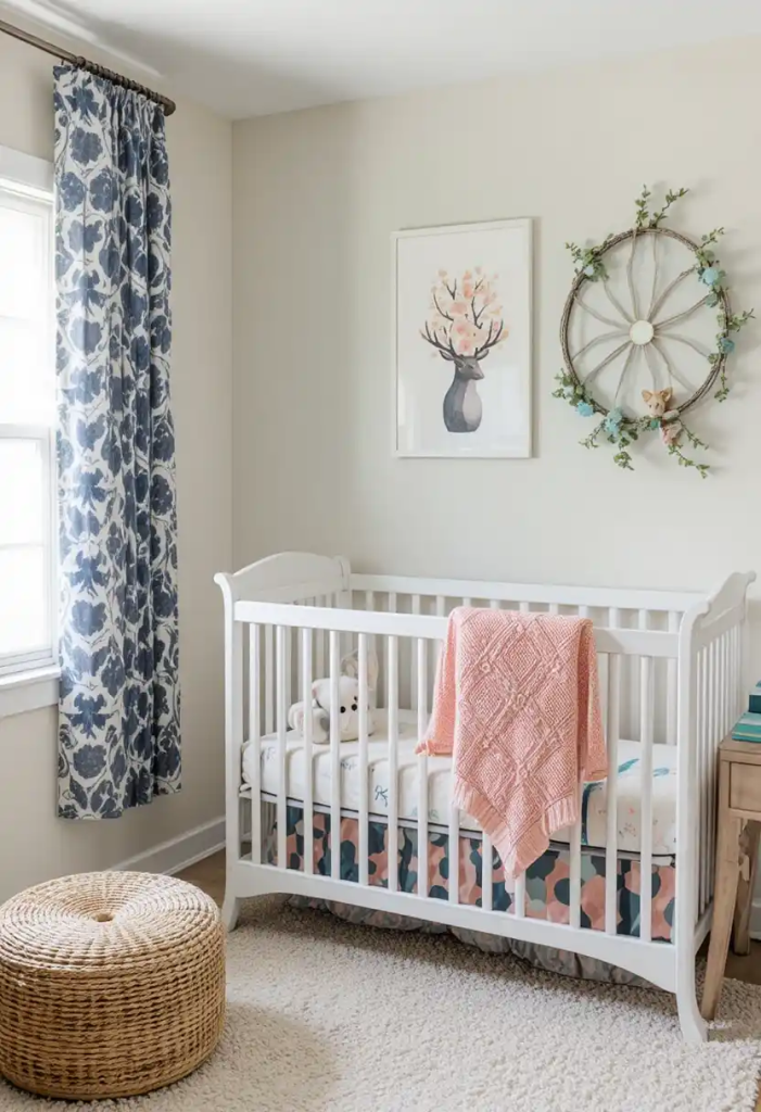 Boho nursery decor 2026 blends textures like macramé, rattan, and woven fabrics. Earthy tones create a warm and cozy environment. This relaxed style feels natural and inviting, making it perfect for a comfortable baby room.